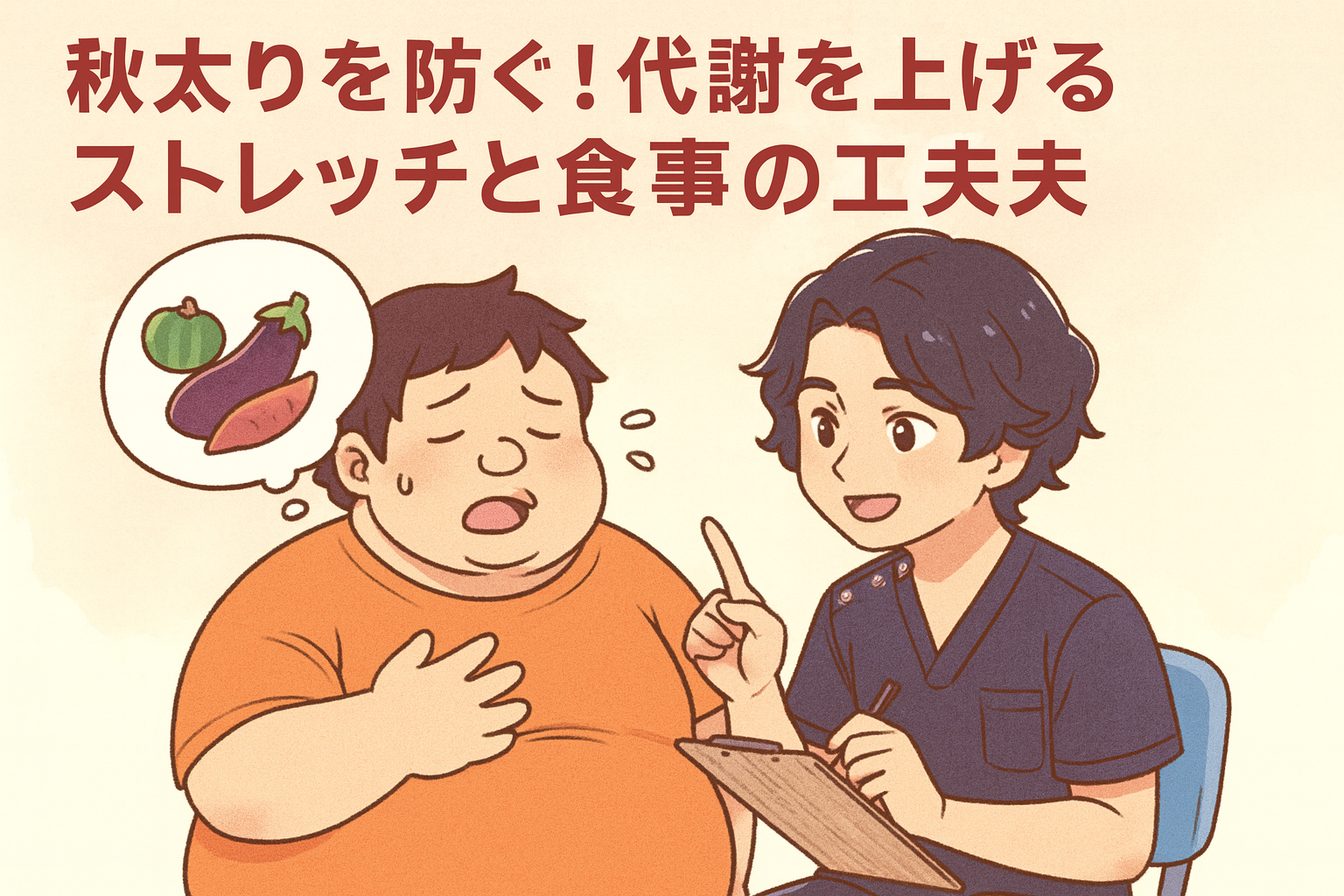 秋になると「最近少し体が重くなった気がする」「夏よりお腹まわりが気になる」と感じる方は多いのではないでしょうか。いわゆる“秋太り”は、気温の変化や食欲の増加、活動量の低下などが重なって起こりやすいものです。この記事では、秋太りを防ぐための代謝を上げるストレッチと食事の工夫について、わかりやすく解説します。さらに当院での施術内容もご紹介しながら、体を整える方法をお伝えします。