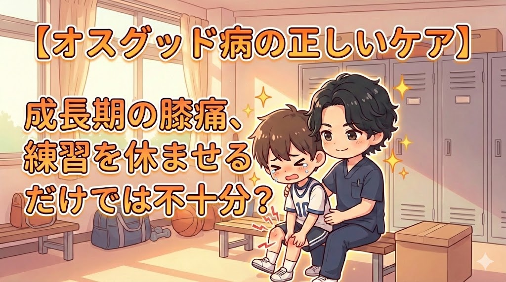 オスグッド病は成長期に多い膝痛で、練習を休むだけでは、筋肉の硬さや身体の使い方が変わらず、再発を繰り返しやすいことがあります。だからこそ、痛みがある時期は「負担の調整」と「正しいケア」をセットで考えることが大切です。