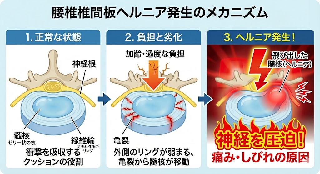 ただの腰痛だと思っていたら、「実は神経が押しつぶされていた」というのがヘルニアの怖いところです。