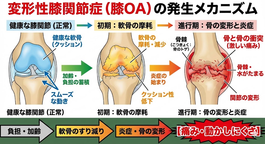 長年の使用で軟骨が少しずつすり減り、その削りカスが関節を包む袋(関節包)を刺激します。すると、身体は異物を排除しようとして「炎症(滑膜炎)」を起こします。これが痛みの主な正体です。